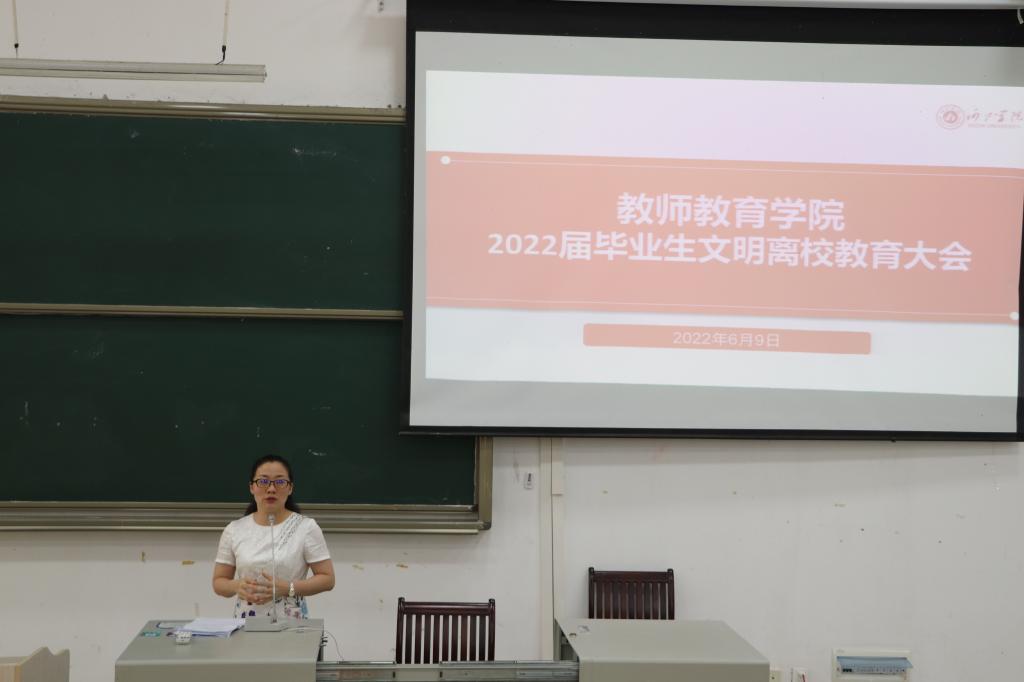 郭英莉副书记在会上交代毕业相关安全事项,她希望同学们能够及时关注毕业群相关通知,办理好毕业之前的所有手续,同时树立安全意识,提高自我保护意识,确保安全顺利找到理想的工作。随后,郭英莉副书记还给学生召开文明离校教育大会和廉洁教育大会。